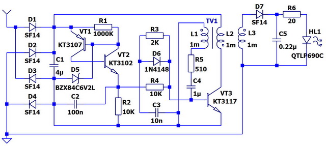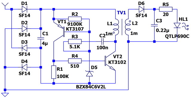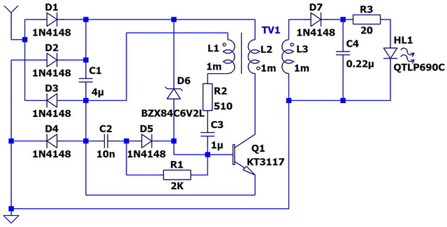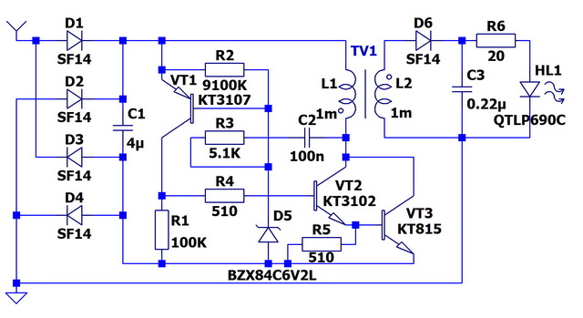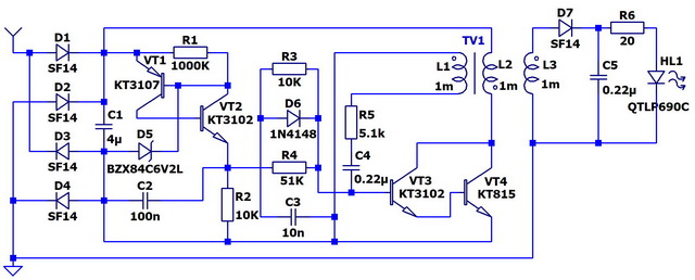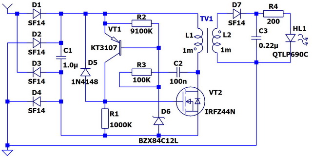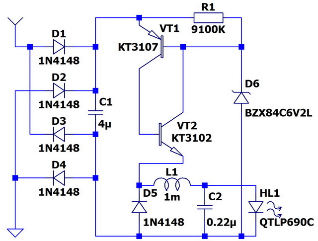 Пожалуй, это самая простая и самая лучшая из всех рассмотренных схем с трансформатором. Мощность определяется только выбором транзистора. Эта схема полностью "высасывает" заряд из накопительного конденсатора. Схема работает, как только ток из антенны превышает токи утечки диода D5, стабилитрона D6 и транзисторов VT1 и VT2. Если нужна высокая чувствительность, имеет смысл сразу подобрать указанные элементы с минимальными токами утечки.