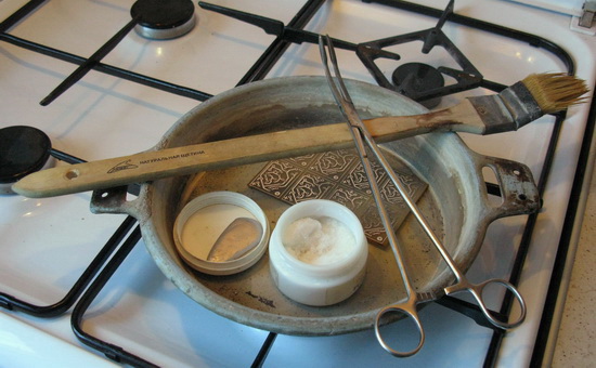 Процесс ведётся в широкой эмалированой посуде. (У меня старинная эмалированая сковорода). Желательно иметь корнцанг, или аналогичное приспособление с длинными ручками, и длинную плоскую кисть.