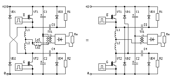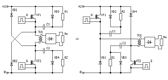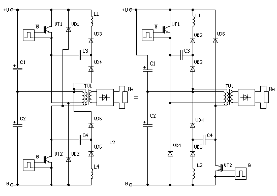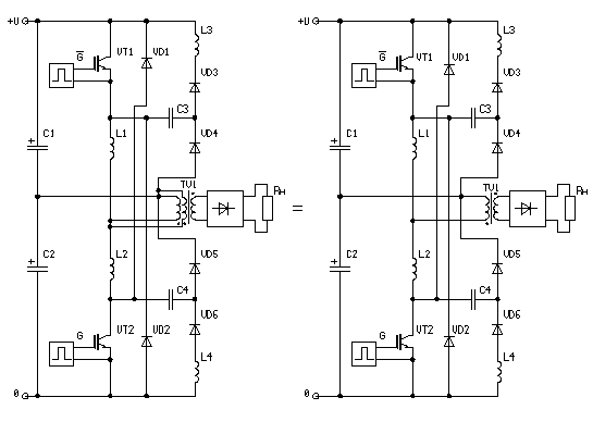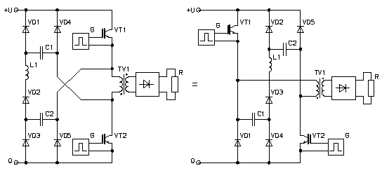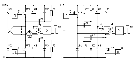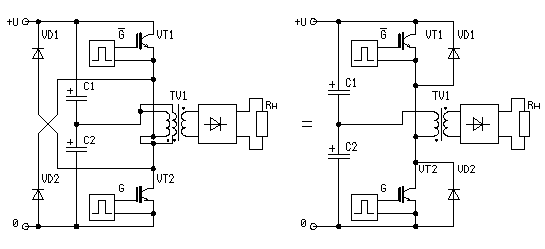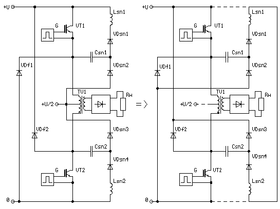 Последовательно соединённые индуктивности Lsn1 и Lsn2 (см рис. 9 справа) можно заменить одной, и два последовательно включённых диода VDsn1 и VDsn4 тоже можно заменить одним. Поскольку схема полностью симметрична, напряжение на выводе средней точки трансформатора TV1 всегда равно U/2, поэтому соединяющий провод показан пунктиром, - в нём, как и в отдельном источнике напряжения U/2, нет необходимости. На рисунке 10 слева показан результат преобразования. Справа та же схема в другом начертании.