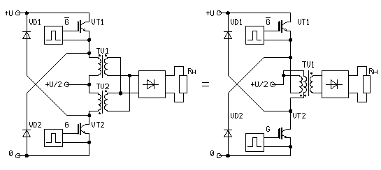 На рисунке 6 слева представлен вариант однотактного каскада, в котором использован один однотранзисторный каскад с нижним ключом и один - с верхним ключом, работающие на общую нагрузку. Напряжение питания каждого из использованных однотранзисторных каскадов равно U/2, а напряжение фиксации равно U - в два раза выше. Справа показан вариант, в котором два трансформатора TV1 и TV2 заменены одним TV1, со средней точкой в первичной обмотке, соединённой с источником питания U/2. Но, поскольку схема полностью симметрична, напряжение на выводе средней точки трансформатора TV1 всегда равно U/2, поэтому соединяющий провод показан пунктиром, - в нём, как и в отдельном источнике напряжения U/2, нет необходимости.