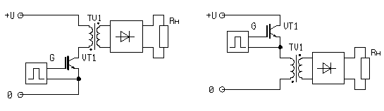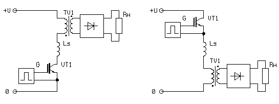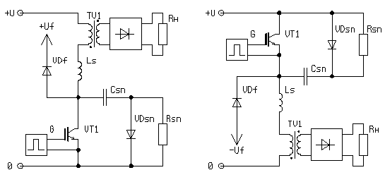 Возможны два варианта одноключевого (однотранзисторного) силового каскада - с нагрузкой, соединённой с положительной шиной питания (на рисунке 1 изображён слева) и с нагрузкой, соединённой с отрицательной шиной питания (на рисунке 1 изображён справа). Исходя из традиционного начертания принципиальных схем, первый вариант иначе называют вариантом "с нижним ключом", а второй - "с верхним ключом". Вывод транзистора, соединённый с трансформатором, будем называть активным.