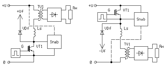 Приёмы, используемые для получения мягкого переключения, в сильной степени зависят от конфигурации схемы силовой части. Поэтому целесообразно начать рассмотрение с простейших – одноключевых схем. Для определённости в качестве ключа будем использовать транзистор IGBT. В качестве нагрузки будем рассматривать трансформатор, поскольку в большинстве случаев в силовой электронике именно он и является нагрузкой. И не будем здесь рассматривать резонансные схемы, требующие отдельного изучения.