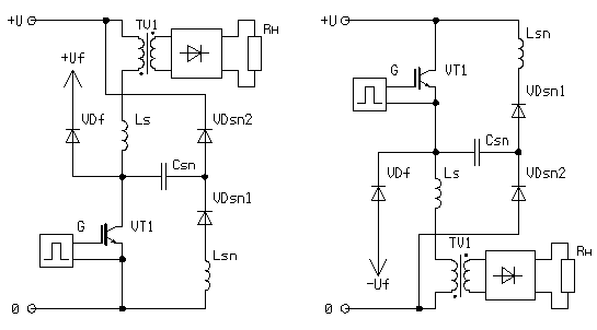 Рис.5. Схемы включения регенеративного LCD-снаббера для нижнего и верхнего ключей