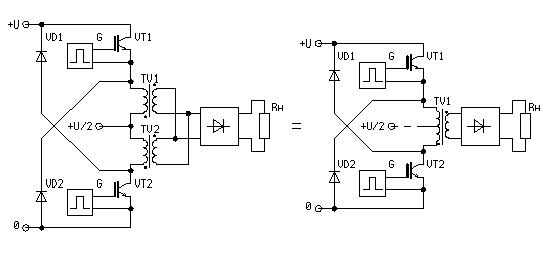 Первичные обмотки в трансформаторе TV1 (см. рис.11 справа) включены синфазно, если соединить начала этих обмоток, как показано на рисунке 12 слева, и перерисовать, как показано на рисунке 12 справа, получится схема, широко известная под названием "полумост" с той разницей, что диоды VD1 и VD2 обычно интегрированы соответственно в транзисторы VT1 и VT2 и часто на схеме полумоста не указываются. Вместо источника напряжения U/2 здесь применён ёмкостный делитель напряжения C1 - C2, что возможно в симметричной схеме, если импульсы, подаваемые на входы транзисторов VT1 и VT2 тоже симметричны, то есть, имеют одинаковую длительность и скважность. Тогда заряды, которые получают и отдают конденсаторы C1 и C2 за один цикл работы схемы равны, и, при достаточной ёмкости, напряжение в точке их соединения будет практически постоянно и равно половине напряжения питания U.