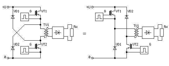 Удалив за ненадобностью из первичной обмотки трансформатора TV1 средний вывод, как показано на рисунке 7 слева, получим широко известную схему "косого моста", показанную на рисунке 7 в двух вариантах начертания. Своё название схема получила из-за того, что, согласно правому изображению, она получается из схемы полного моста путём замены транзисторов одной из диагоналей диодами.