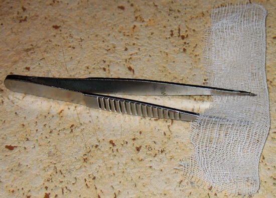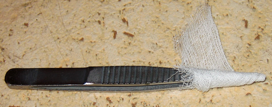 и наматывается в рулон диаметром 3-5 мм на пинцет, сложенной стороной к рабочему торцу рулона. Оставшаяся часть бинта наматывается на середину пинцета и служит для удержания рулона в свёрнутом состоянии: