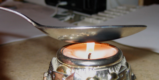 Теперь необходимо заготовить сажу. Для этого требуется чистую поверхность, например, столовую ложку из нержавейки, закоптить в пламени свечи, спички, или зажигалки, если её не жалко. Для чистки одного объектива или дисплея достаточно сажи от одной спички.