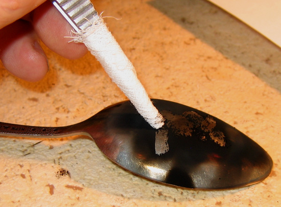 Ложка с копотью откладывается в сторону, Отрезанная полоска бинта сворачивается вдвое вдоль её длинной стороны, захватывается пинцетом ближе к середине, в месте, к которому не прикасались пальцы рук: