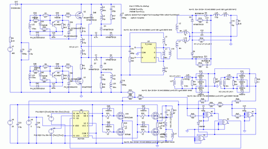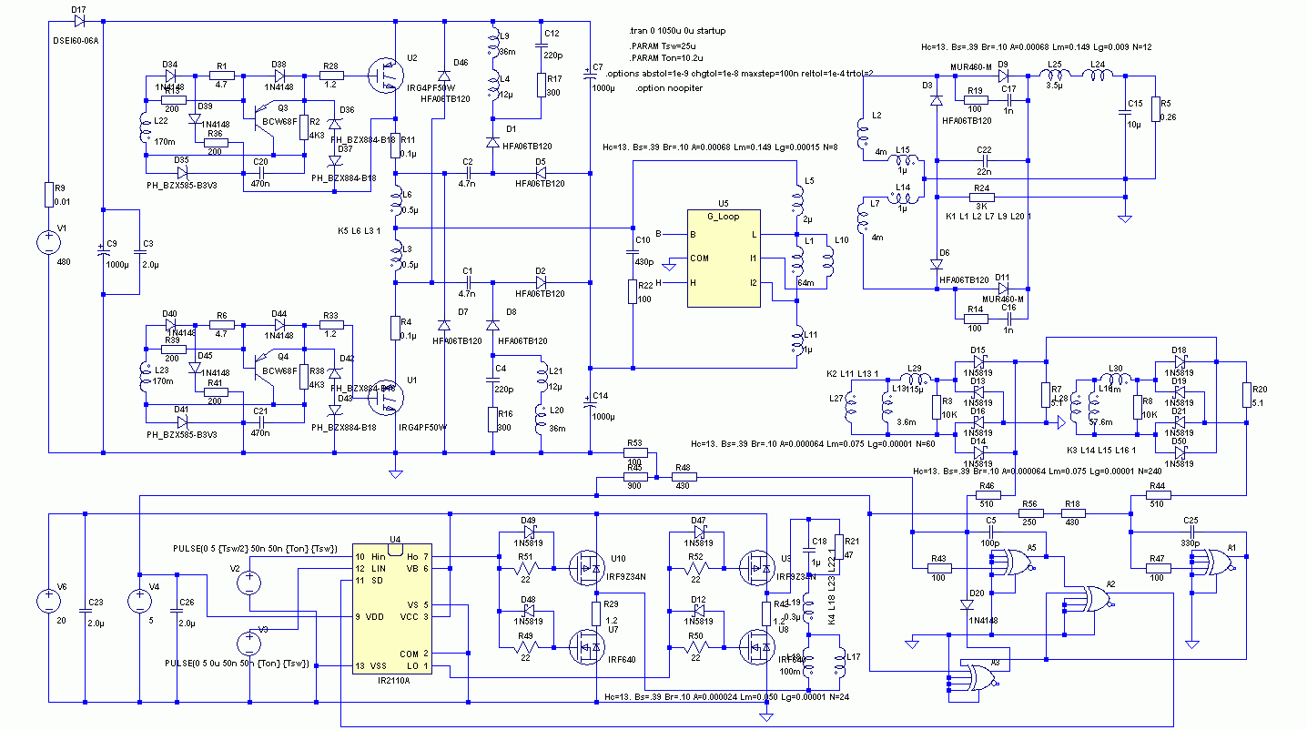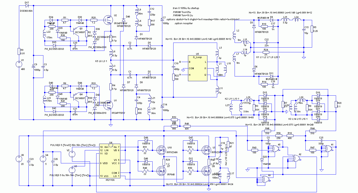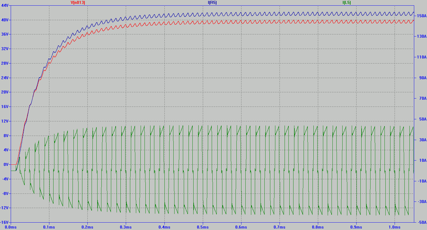 На рисунке представлена модель силовой части Полумостовой схемы источника питания сварочного полуавтомата, рассчитанного на ток 150 А при напряжении 40 В с питанием от трёхфазной сети. Нижняя часть рисунка представляет собой модель "Схемы защиты двухтактного преобразователя от превышения установленных значений тока в первичной обмотке трансформатора и тока намагничивания". (Здесь описание работы схемы защиты в формате .doc). Резисторы R53 - R45 - модель переменного резистора RP2 установки тока поцикловой защиты, а резистор R56 соответствует резистору RP1 установки предельного тока намагничивания. Элемент U5 с названием G_Loop - полезное дополнение к LTspice IV от Валентина Володина, позволяющее смотреть петлю гистерезиса трансформатора непосредственно в модели. Исходные данные для расчёта трансформатора получим в самом тяжёлом для него режиме - при минимально допустимом напряжении питания и максимальном заполнении ШИМ. На рисунке ниже представлены осциллограммы: Красным цветом- выходное напряжение, синим - выходной ток, зелёным - ток в первичной обмотке трансформатора.