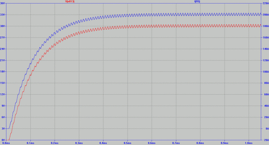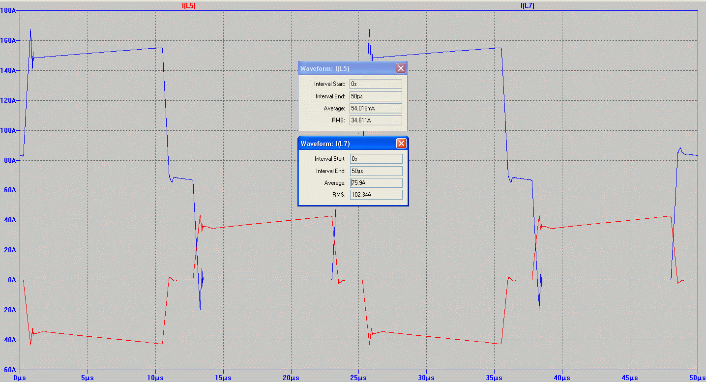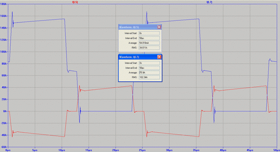 Ещё необходимо знать среднеквадратичные (RMS) токи в первичной и вторичной обмотках. Для этого опять воспользуемся моделью. Выберем графики токов в первичной и вторичной обмотках в установившемся режиме: