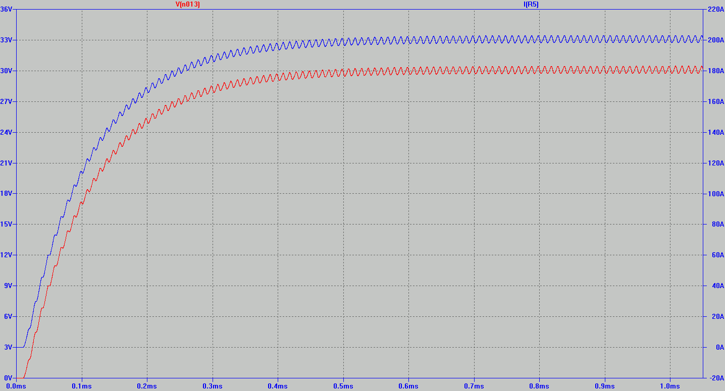 Сопротивление нагрузки, согласно закону Ома, установили 0,15 Ом и для уменьшения выходного напряжения уменьшили длительность импульса до 7,0 мкс. Получили на выходе ток 200 А при напряжении 30 В: