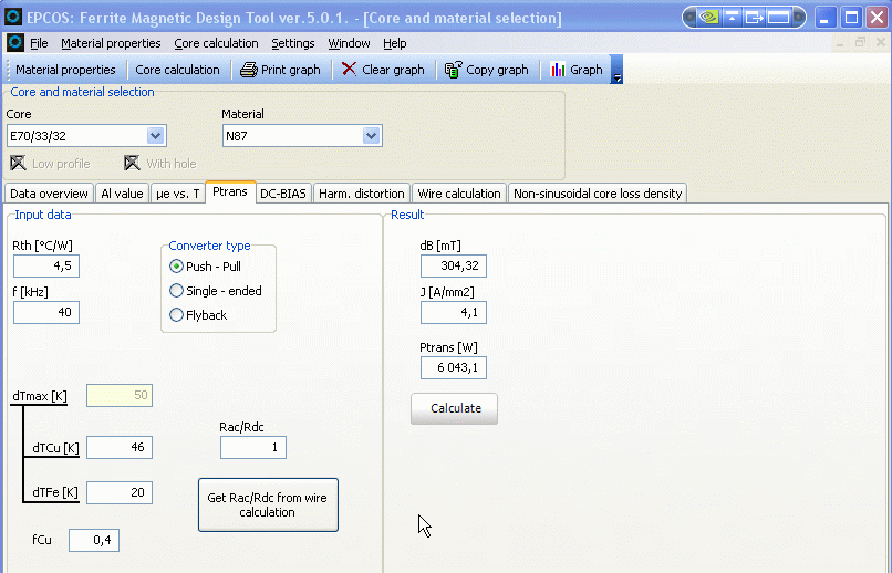 Выбор и расчёт трансформатора проведём на примере использования его в сварочном источнике тока для полуавтомата, рассчитанного на ток 150 А при напряжении 40 В, с питанием от трёхфазной сети. Произведение выходного тока 150 А на выходное напряжение 40 В даёт выходную мощность устройства Рвых = 6000 Вт. Коэффициент полезного действия выходной части схемы (от транзисторов до выхода) можно принять равным КПДвых = 0,98. Тогда максимальная мощность, поступающая на трансформатор равна Ртрмах = Рвых / КПДвых = 6000 Вт / 0,98 = 6122 Вт. Частоту переключения транзисторов выберем равной 40 - 50 КГц. В данном конкретном случае она является оптимальной. Для уменьшения габаритов трансформатора частоту необходимо повышать. Но дальнейшее повышение частоты приводит к увеличению потерь в элементах схемы и при питании от трёхфазной сети может привести к электрическому пробою изоляции в непредсказуемом месте.. В России наиболее доступны ферриты типа Е из материала N87 фирмы EPCOS. Воспользовавшись программой "Ferrite Magnetic Design Tool", определим подходящий для нашего случая сердечник: