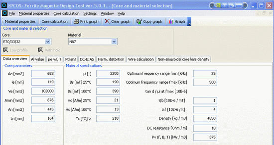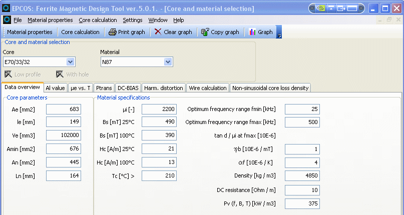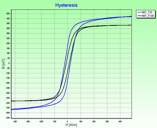 Свойства сердечника E70/33/32 и материала N87 при температуре 100 °С приведены на вкладке:
