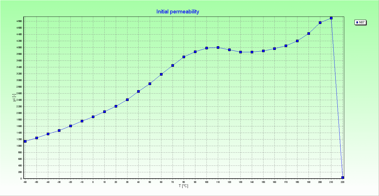 Сразу заметим, что определение получится оценочным, поскольку программа предполагает мостовую схему выпрямления с одной выходной обмоткой, а в нашем случае выпрямитель со средней точкой и две выходные обмотки. В результате следует ожидать некоторого повышения плотности тока по сравнения с заложенной нами в программу. Наиболее подходит сердечник E70/33/32 из материала N87. Но для того, чтобы он передал мощность 6 КВт, необходимо увеличить плотность тока в обмотках до J = 4 А/мм2, допустив больший перегрев по меди dTCu[K] и поставить трансформатор в обдув, для снижения теплового сопротивления Rth[°C/W] до Rth = 4,5 °C/W. Для правильного использования сердечника, необходимо ознакомиться со свойствами материала N87. Из графика зависимости проницаемости от температуры: