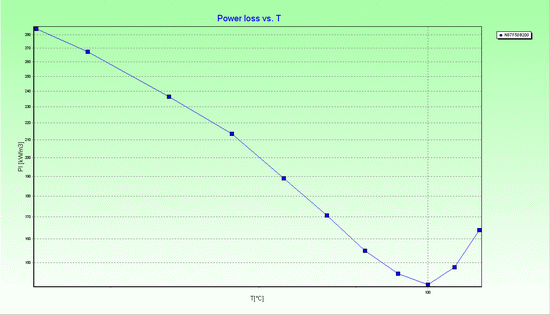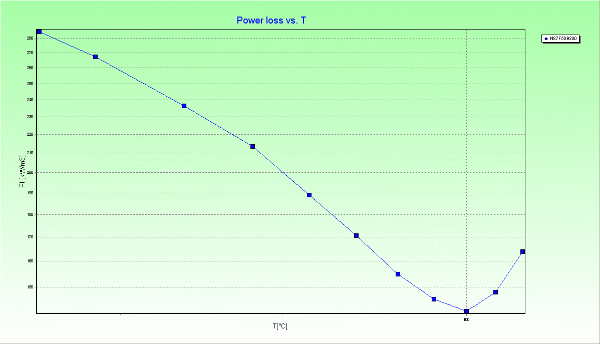 следует, что при температуре 100 °С потери в сердечнике минимальны. Сердечник адаптирован для работы при температуре 100 °С. Это подтверждает необходимость использовать при моделировании свойства сердечника при температуре 100 °С.