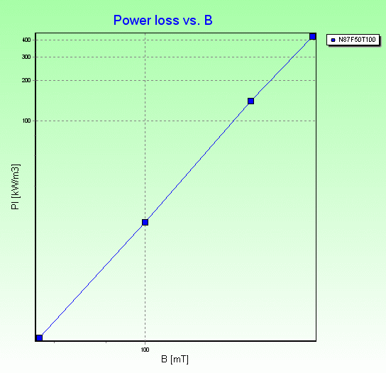 На вертикальной оси одному вольту соответствует индукция в 1Т, на горизонтальной оси одному вольту соответствует напряжённость поля в 1 А/м. Из этого графика нам надо взять размах индукции, который, как видим, равен dB = 400 мТ = 0,4 Т (от - 200 мТ до +200 мТ). Вернёмся к программе Ferrite Magnetic Design Tool, и на вкладке "Pv vs. f,B,T" посмотрим зависимость потерь в сердечнике от размаха индукции В: