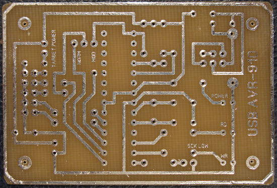 Линии по краю платы - 0,3 мм. На дорожках виден слой покрытия бумаги. Некоторые отверстия для сверления им залеплены. Я их не удалял. Они хорошо видны при сверлении, и сверло центрируется слоем краски ничуть не хуже, чем слоем меди.