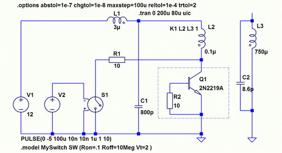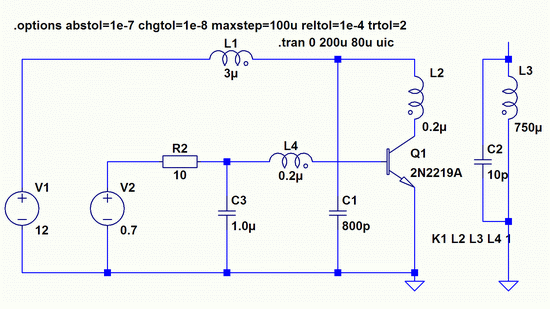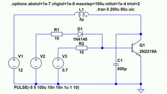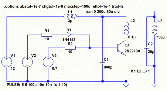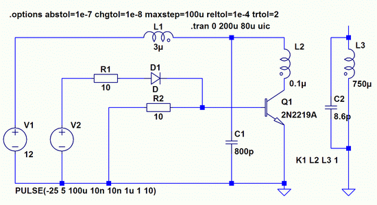 Интересно, что в модели работает и с закороченными выводами эмиттера и базы, И даже работает с простым выпрямительным диодом. Однако только в том случае, если в модели заложено время восстановления диода больше, чем время его открывания. Это может служить ключём к пониманию механизма накачки колебательного контура. То есть, за время восстановления перехода в контур поступает энергии больше, чем расходуется при его открывании. Если реальные диоды обладают таким свойством, то построение генератора вполне возможно при соблюдении соотношений параметров схемы, допускающих режим генерации. Более того, такие схемы могут быть интересны с той точки зрения, что восстановление закрытого состояния у диодов может происходить практически мгновенно, что на практике используется для генерации импульсов наносекундных длительностей. Но в железе я этого не проверял, и пока здесь публиковать не буду. Это тема для другой статьи.