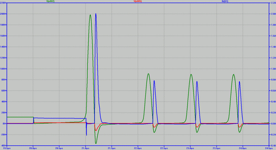 К сожалению, хорошей модели диода найти не удалось, поэтому некоторые несоответствия модели и реального объекта присутствуют, но в общем картина близка к реальности. В частности, реально измеренные выбросы на катушке, в зависимости от типа диода, имеют величину до 100 В. Максимальный выброс удалось получить на коллекторном переходе транзистора 2Т908А – порядка 250 В, при этом он не пробивается. Следует учесть также, что измерения производились осциллографом С1-65, который имеет полосу пропускания 50 МГц и время нарастания ПХ = 10 нс. Можно предположить, что на самом деле выбросы немного больше.