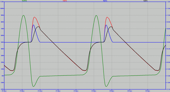 Рис. 4. Временные диаграммы токов в транзисторе. Направления токов приведены к току в базе. Синий - ток в базе транзистора. Красный - ток в коллекторе . Чёрный - ток в эмиттере Зелёный - напряжение на коллекторе.
