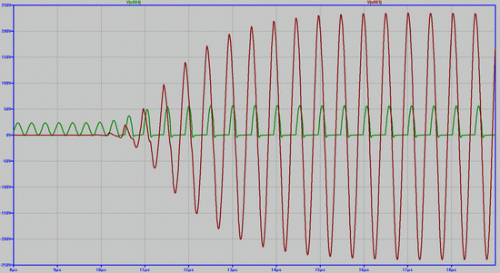 Для поддержания и увеличения амплитуды колебаний в катушке Теслы, необходимо увеличивать частоту импульсов тока в индукторе, при этом каждый импульс должен попадать в нужную фазу. На практике добиться этого можно, используя синхронизацию генератора от счётчика, на вход которого подаются колебания с катушки Теслы. Поскольку наша задача – не проектирование конкретного узла, я просто в модели подобрал частоту генератора. Модель такого процесса приведена на рисунке 13.