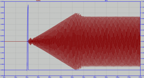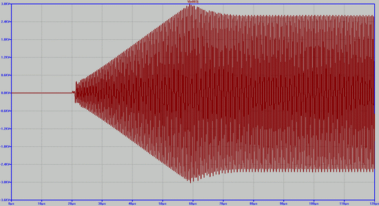 Запуск генератора осуществляется одиночным импульсом напряжения с генератора V2. Из диаграмм следует, что генерация начинается после окончания запускающего импульса тока в базе транзистора.